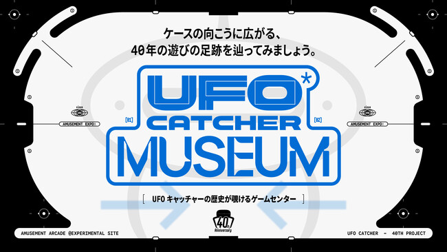 1985年の誕生から40年。さまざまな手法で歴史を振り返る展示となっています。エポックメイキングなUFOキャッチャーシリーズの実機や年表の展示、アーム、コントロールパネル(通称:コンパネ)、UFOキャッチャーの想い出などを楽しく展示いたします。