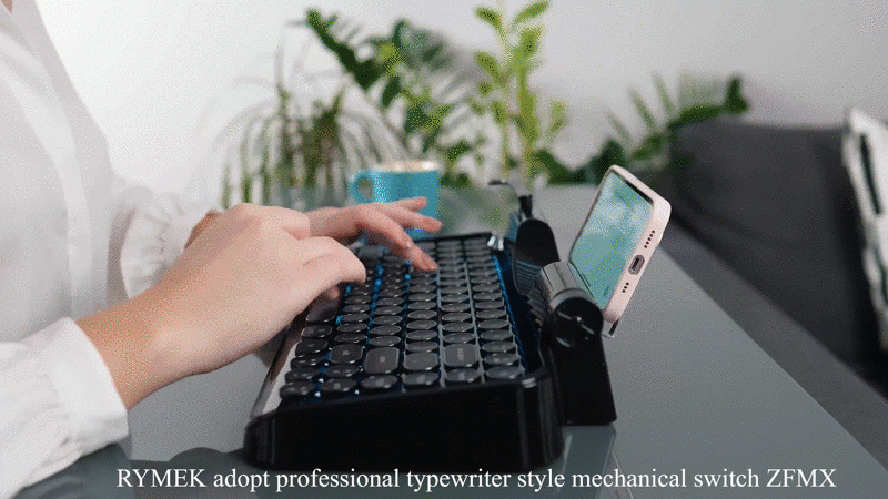 【Rymek&Ronlulu】は、メカニカルキーボードの「Rymek」と肉球キー「Ronlulu」で構成されています。「Rymek」は、タイプライターからインスピレーションを得たメカニカルキーボードとなっています。独特の心地良い打鍵感に加えて、スマホやタブレットを固定できるスタンド付きで最大3台のデバイスとペアリングが出来るなど機能性にも優れています。
