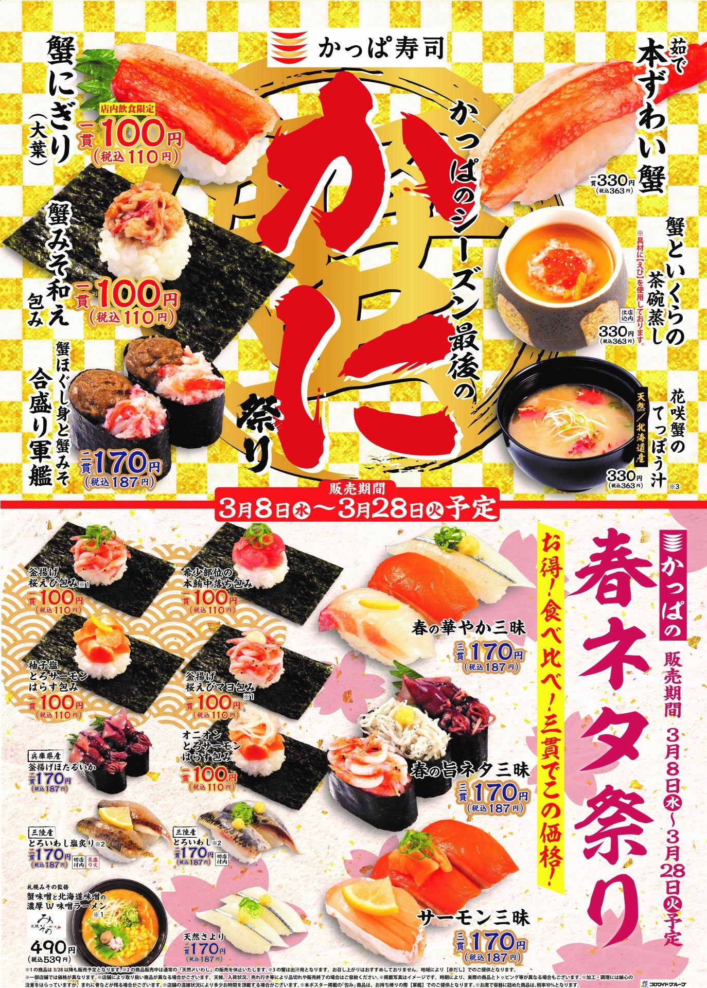 | 3月8日(水)より開催中!春の訪れを感じ、季節の移ろいを楽しむ豪華Wフェア 『かっぱのシーズン最後のかに祭り』&『かっぱの春ネタ祭り』 |