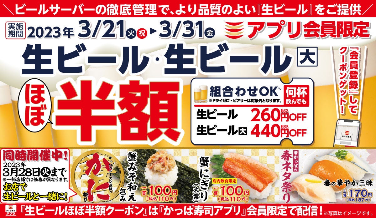 【かっぱ寿司アプリ会員限定】お得に生ビールが楽しめる11日間 春に乾杯!何杯飲んでも「生ビールほぼ半額キャンペーン」
