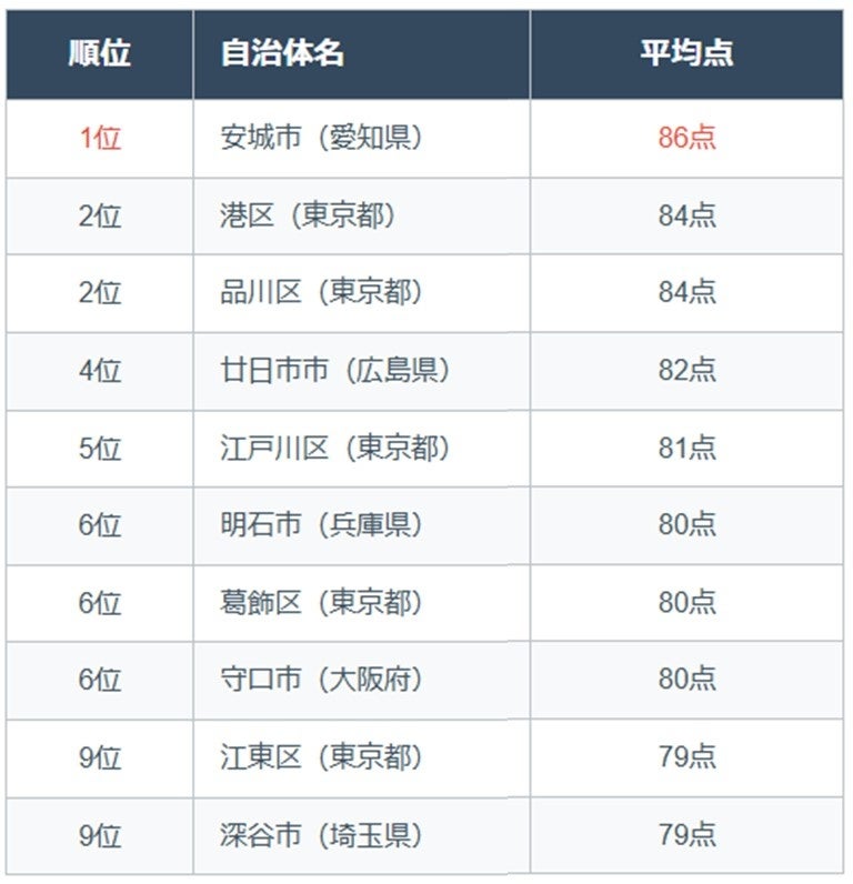 本調査は、子育て世帯が感じる地域の「子育てのしやすさ」を100点満点で評価いただき、その平均点をランキング化したものです。調査の結果、1位は愛知県安城市(86点)、2位は東京都港区(84点)、3位は東京都品川区(82点)となりました。また、約1万件のコメント分析から、子育て世帯が重視しているのは「支援の数」だけでなく、「支援の質」や「届け方」であることが明らかになりました。