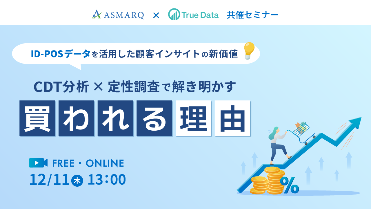 株式会社アスマーク(東京都渋谷区東、代表取締役:町田正一)は、2025年12月11日(木)13:00に、 日本最大級6000万人規模の消費者購買データを扱うビッグデータプラットフォーム運営する、株式会社True Data(東京都港区、代表取締役社長:米倉 裕之)と共催形式で、「CDT分析×定性調査」をテーマにセミナーを実施いたします。