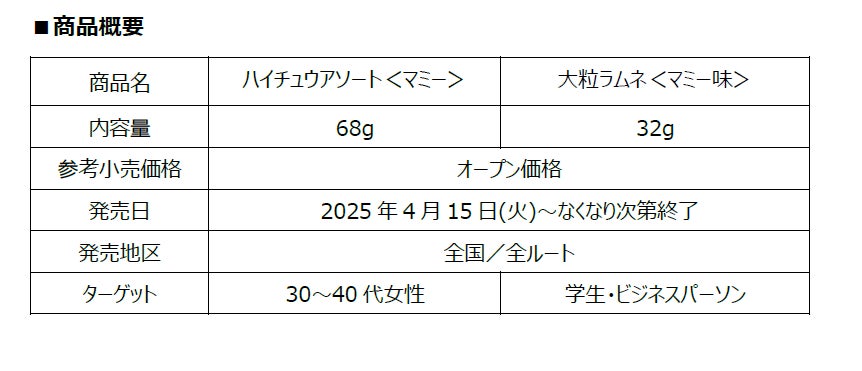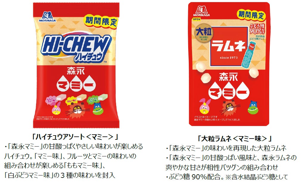 森永製菓株式会社(東京都港区芝浦、代表取締役社長 COO・森 信也)は、森永乳業株式会社(東京都港区東新橋、代表取締役社長・大貫 陽一)の人気商品「森永マミー」とコラボレーションした「ハイチュウアソート<マミー>」「大粒ラムネ<マミー味>」の2品を4月15日(火)より新発売いたします。「森永マミー」の甘酸っぱく、やさしい味わいを当社の人気のお菓子で表現しました。