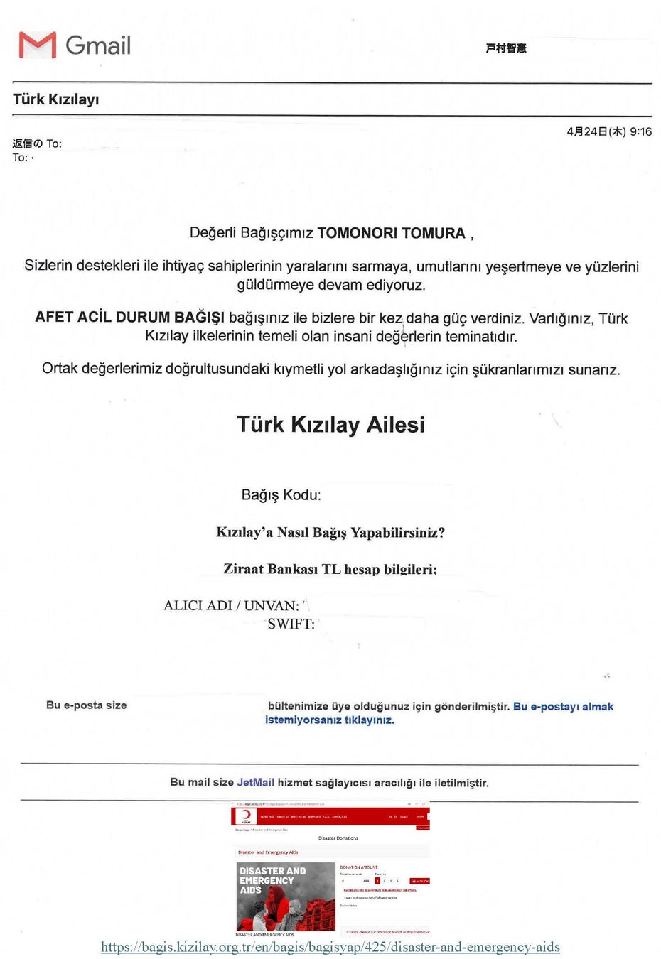 ・寄付先: トルコ赤新月社さまの災害支援寄付( https://bagis.kizilay.org.tr/en/bagis/bagisyap/425/disaster-and-emergency-aids )