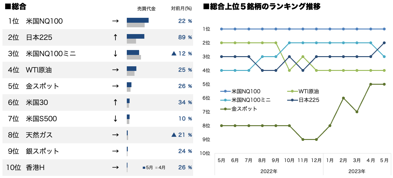 2023年5月のCFD売買代金ランキングは、日経平均株価が33年ぶりの高水準となったことを受けて「日本225」の売買代金が伸長し、総合ランキング2位にランクインしました。また、外国株ランキングにおいては、AI開発向け半導体の需要増加に伴い四半期決算で過去最高業績を記録し、株価が急騰した米半導体大手の「NVIDIA」が、1年8カ月にわたり首位であった「テスラ」を抜いて1位にランクインしました。