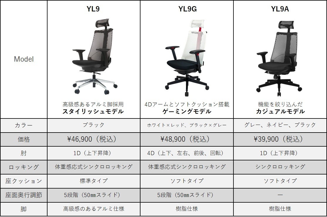 2021年4月:ゲーミングモデル「YL9G」を発売。アームレストの機能を強化し、ソフトクッションを搭載することで長時間使用にも対応。