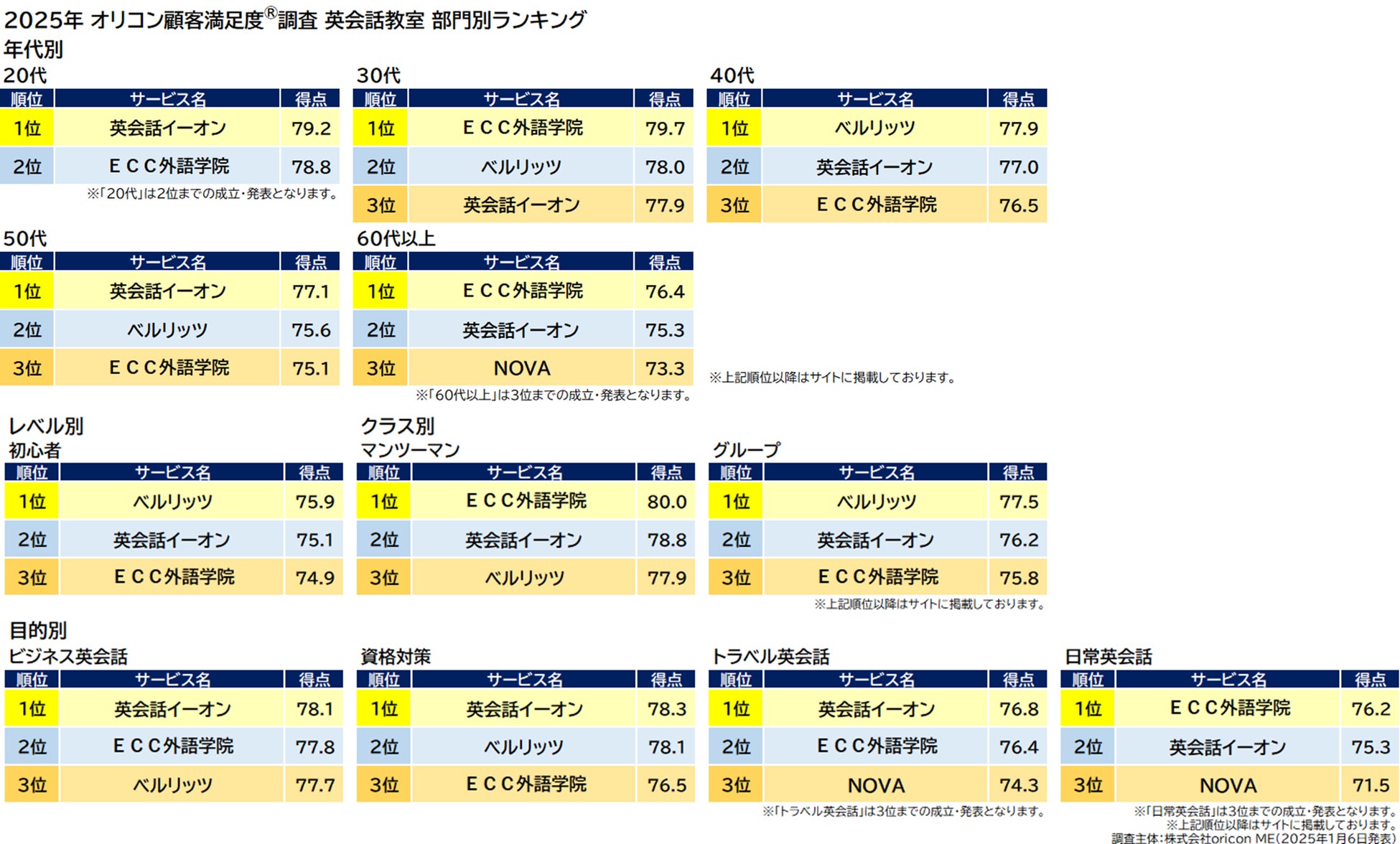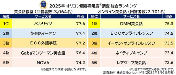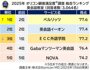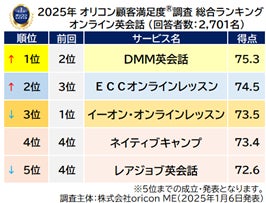 満足度の高い『英会話教室』『オンライン英会話』ランキング┃英会話教室は【ベルリッツ】が4度目の総合1位/オンライン英会話は【DMM英会話】が2度目の総合1位に(オリコン顧客満足度調査)