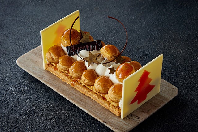 王冠をかたどったフランスの伝統菓子を、木村成克シェフが長方形にアレンジ。サクサクに焼きあげたパイに、カスタードクリームを詰めてキャラメリゼしたほろ苦いプティシュー、シャンティクリームをのせました。クリームはサワークリーム入りで、食事の後でもさっぱりとお召しあがりいただけます。