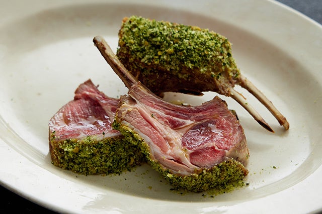 お肉自体の旨みが強く、香りも豊かな仔羊。そのおいしさをシンプルに堪能していただけるメインディッシュです。骨付き肉の表面にマスタードを塗ってからクラッシュピスタチオとハーブをミックスしたパン粉をまとわせて焼き、香りと食感にアクセントを付けました。赤ワインとよく合います。