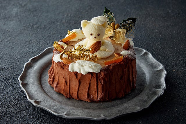 ホテルパティシエの経験もある仲村和浩シェフの、繊細な技が輝くチョコレートケーキです。小麦粉を加えず仕あげたほんのりビターなガトーショコラに、自家製オレンジコンフィチュールとヘーゼルナッツプラリネのムースを重ね、雪化粧したホワイトチョコレートのクマをのせています。