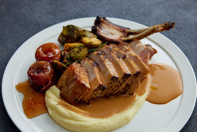 豚の骨付き肉をじっくりロースト。イタリアのマルサラワインで風味付けしたクリームソースでお召しあがりいただきます。付け合わせに、マッシュポテト、芽キャベツとマッシュルームのロースト、甘酸っぱい姫りんごのローストを添えて。これ一品で食卓が盛りあがる、お子さまも食べやすいメニューです。