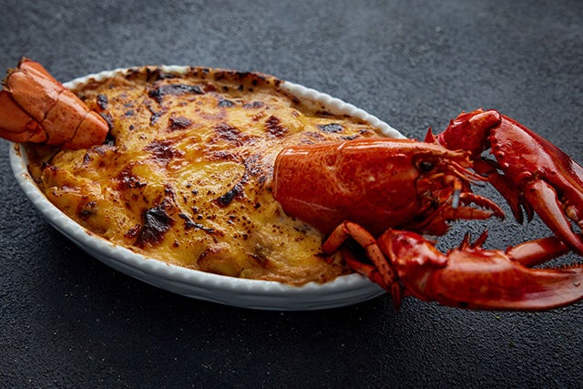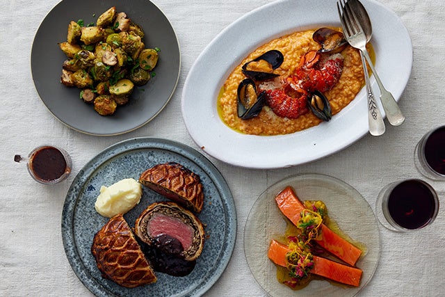 鹿児島産黒毛和牛のパイ包み焼き 黒トリュフソース約500g、オマール海老とムール貝のリゾット2個、自家製サーモンマリネ オレンジラビゴットソース2切れ、芽キャベツとマッシュルームのロースト200g