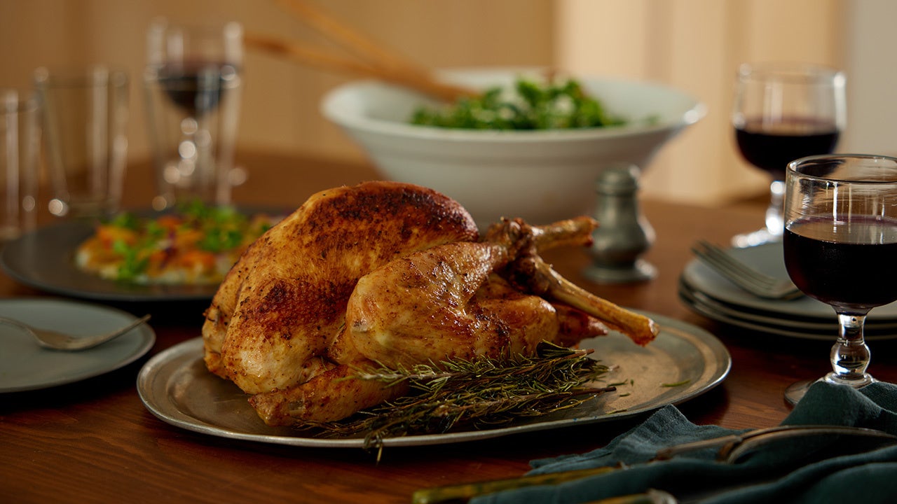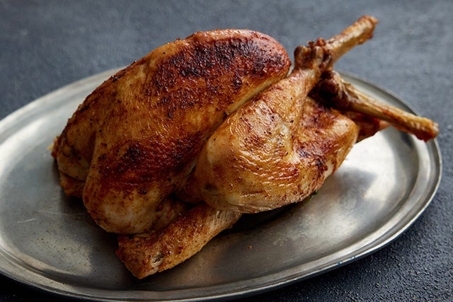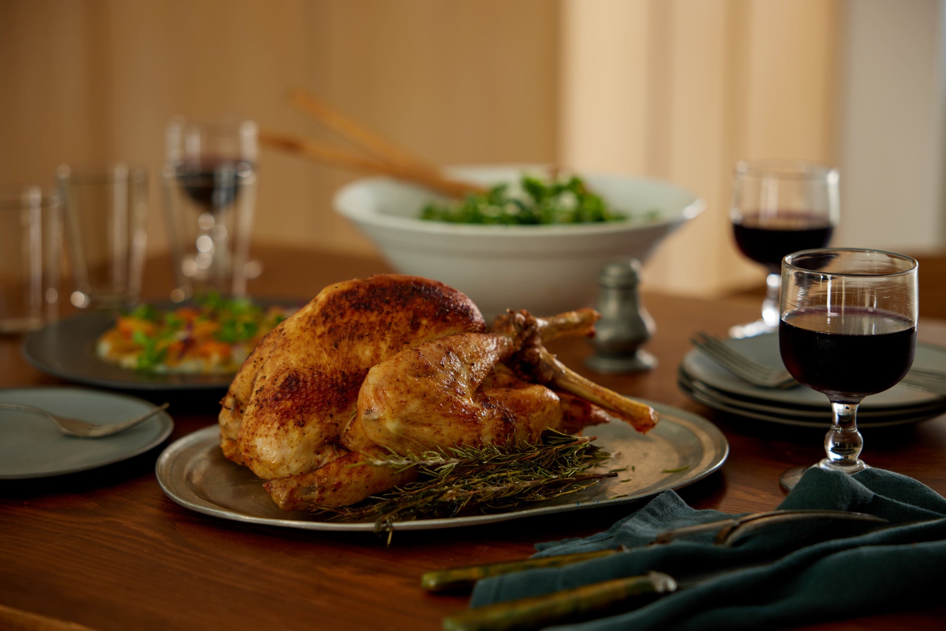 アメリカのDEAN & DELUCAの『COOK BOOK』から着想を得たクラシックなローストチキンです。ハーブとともに下味をつけ、ミックススパイス入りのグースファット(鴨脂)を塗りながら、香り高く風味豊かに焼き上げました。最初に低音でじっくり焼き、中はしっとりジュージーに。仕あげに高温で焼いて、表面はパリッと香ばしく。