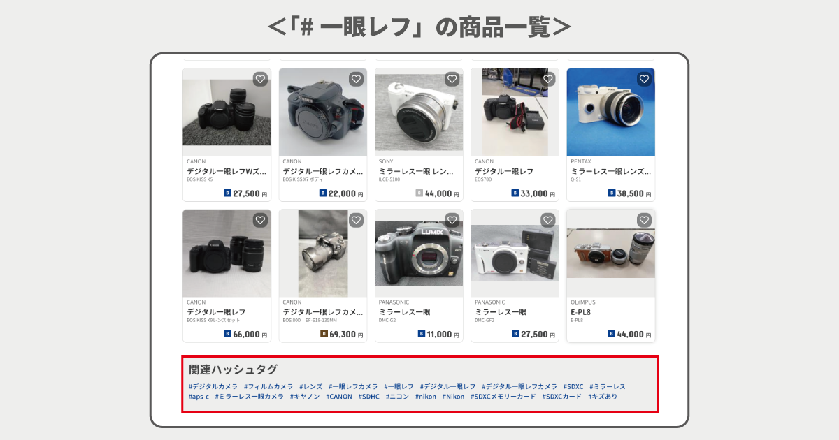 ハッシュタグ検索経由の商品一覧ページの下部に、関連ハッシュタグが表示されるようになりました。これにより、ユーザーは興味・関心に沿ったハッシュタグを直感的に選択してサイト内を回遊でき、豊富な商品を効率よく確認できるほか、比較検討もしやすくなるため、快適な検索体験の提供に貢献します。
