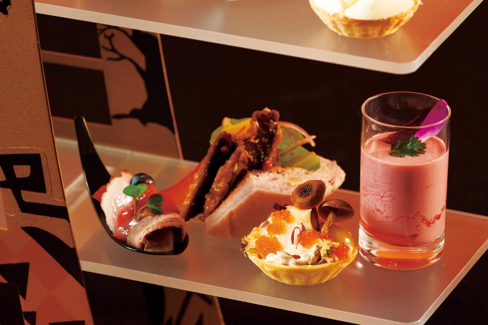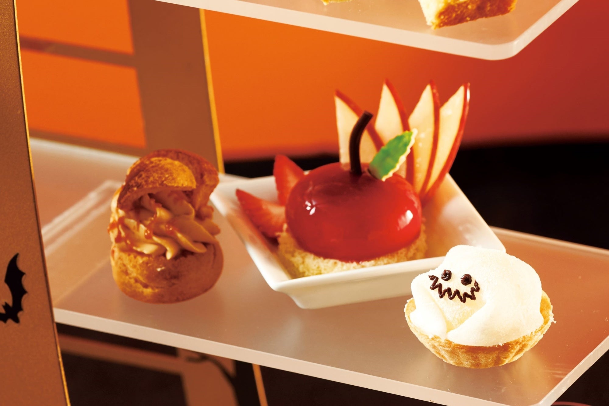 ハロウィンをテーマにコウモリやおばけでデコレーションされたスタンドには、柿、栗、かぼちゃ、さつまいもなどを使った秋の味覚を満喫できる13種類のスイーツとセイボリーが並び、ハロウィン気分を盛り上げます。見て、食べて、楽しめる、この時期だけの特別なアフタヌーンティーを存分にご堪能ください。