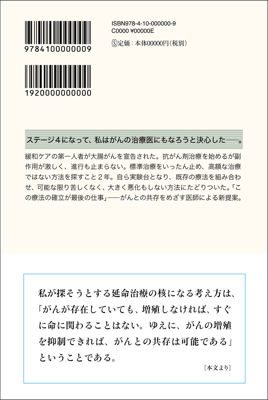 本書は、がんになった緩和ケア医である私自身の体験記です。ステージ4の固形がんに対して、ほとんどの治療医は、エビデンスに基づいた抗がん剤治療こそが、最善の医療だと考えています。しかし、それはあくまで医師から見た最善であって、必ずしも患者のそれではありません。がんは増殖しなければすぐに命にかかわることはなく、増殖を抑制できればがんとの共生は可能だという考えのもと、この数年、試行錯誤を繰り返してきました。近い将来、がんの治療医が、「抗がん剤治療」と「がん共存療法」という2つの選択肢をもって、患者さんと接することができれば、患者さんたちはより満足した人生の晩期を迎えることができると信じています。
