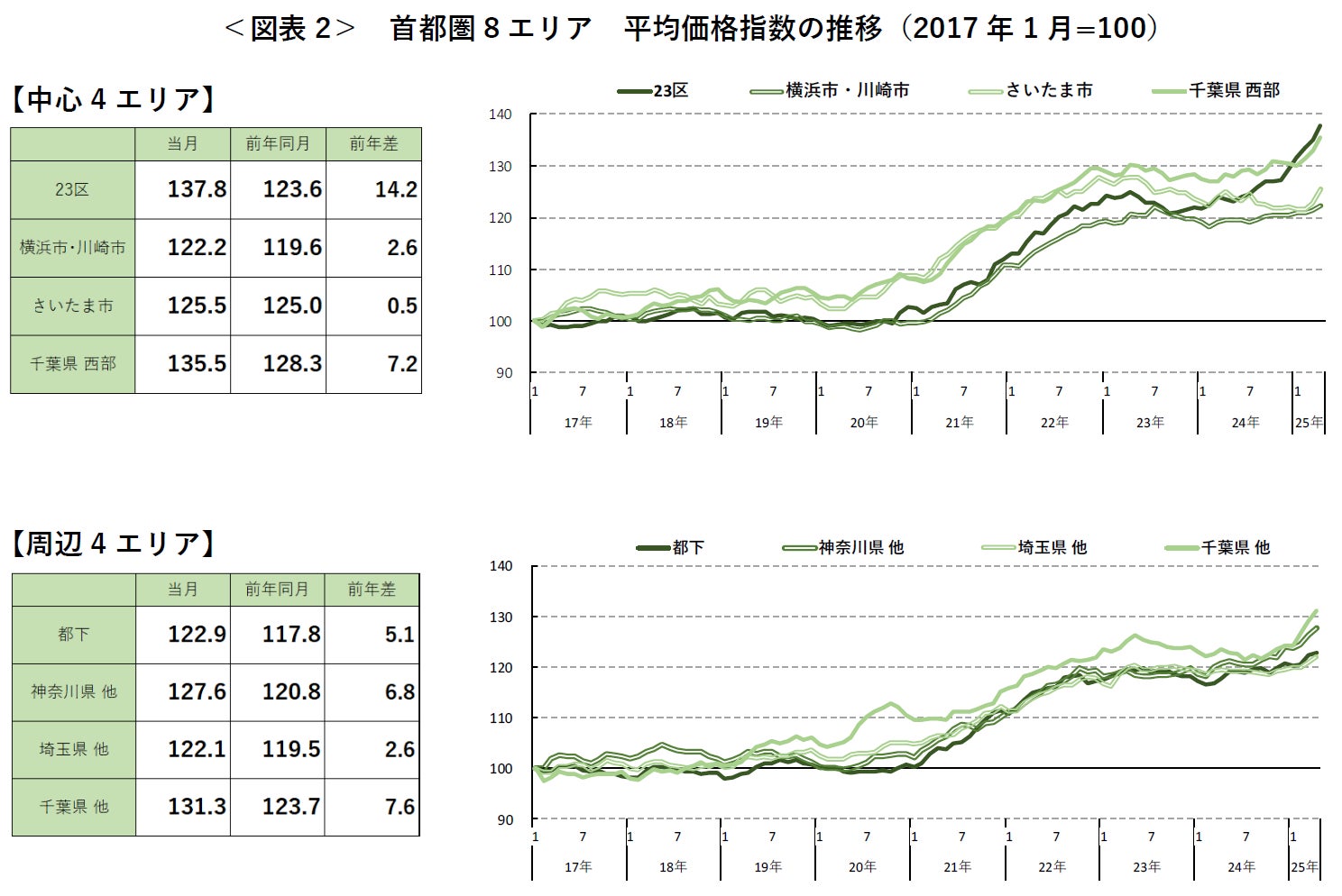 なお、東京都(23区/都下)、神奈川県(横浜市・川崎市/他)、埼玉県他、千葉県(西部/他)の7エリアで2017年1月以降最高額を更新。