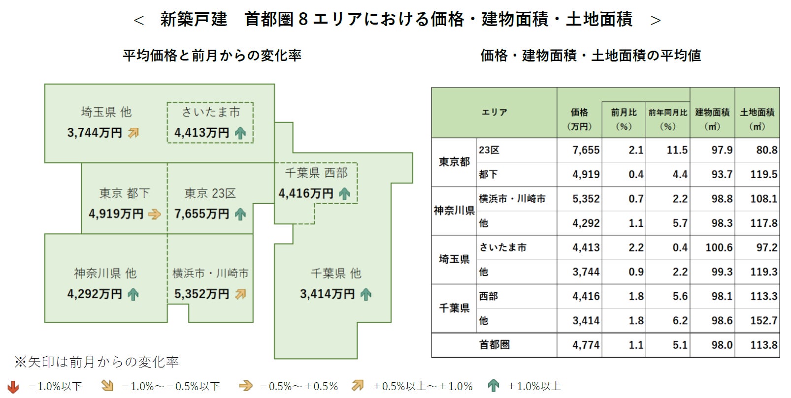 ●首都圏の新築戸建の平均価格は4,774万円で、前月比+1.1%と3カ月連続で上昇。前年同月比は+5.1%と8カ月連続で上昇。