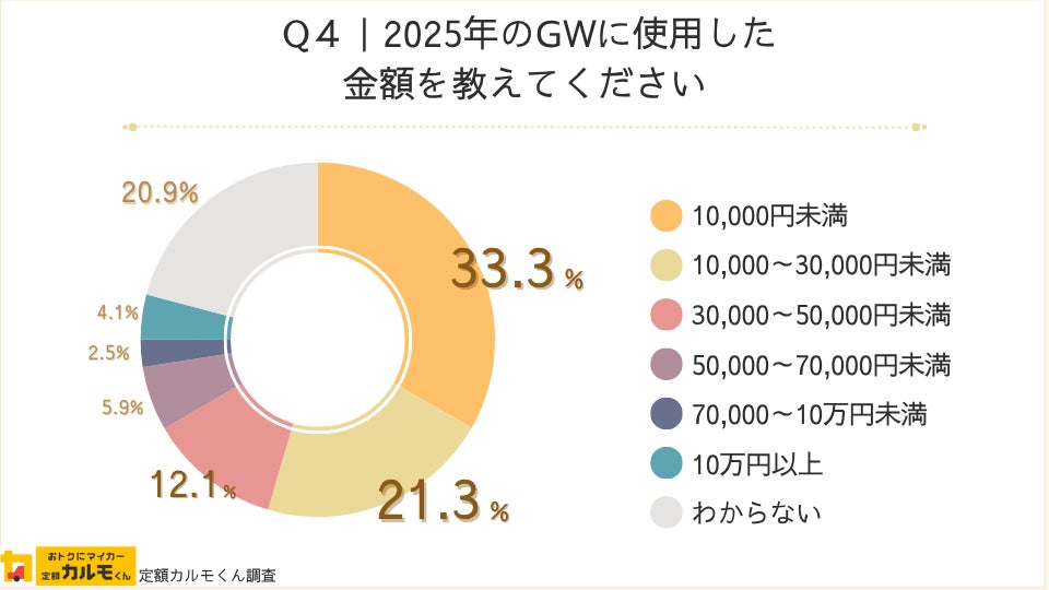 続いて、対象者全員に2025年のゴールデンウィークで使用した金額を聞いたところ、「10,000円未満」が33.3%で最も多く、次いで「10,000~30,000円未満」が21.3%となり、半数以上の方が30,000円未満に収めていたことがわかりました。