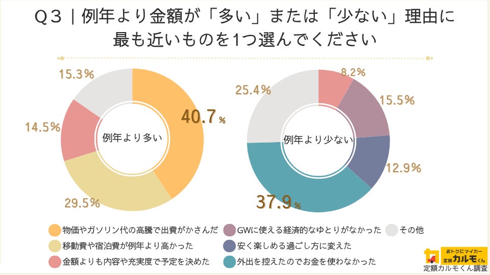 Q2で「多い」または「少ない」と回答した方にその理由を聞いたところ、「多い」と回答した方では「物価やガソリン代の高騰で出費がかさんだ」が40.7%、「少ない」と回答した方では「外出を控えたのでお金を使わなかった」が37.9%でそれぞれ最多となりました。