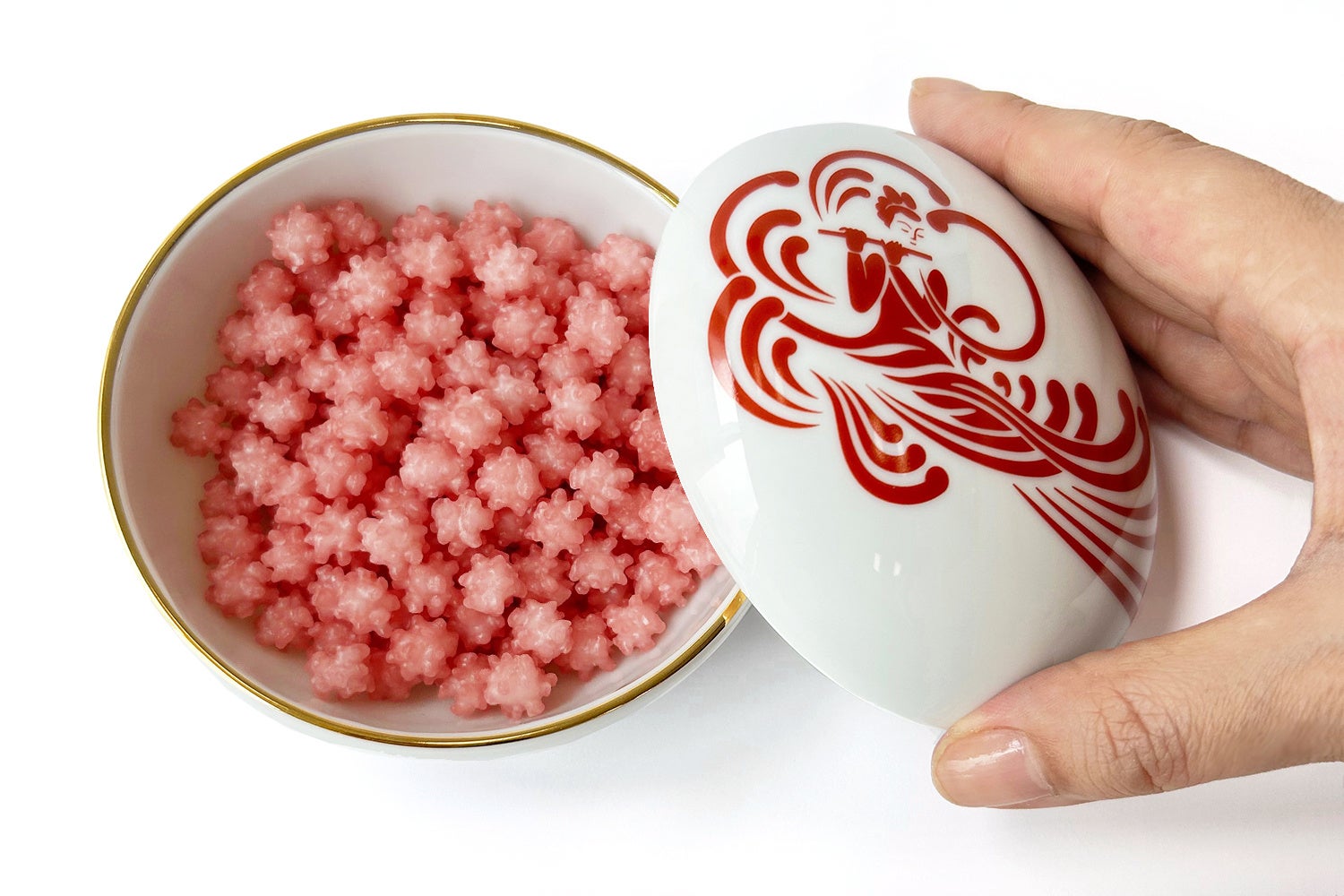 老舗ブランドたち吉により制作された国立劇場の天女の紋をモチーフにした豪華なボンボニエールと、創業以来、一子相伝の製法で金平糖を作り続ける日本で唯一の金平糖専門店「緑寿庵清水」の金平糖のセット。金平糖は、ボンボニエールと合わせて華やかで縁起の良い紅白カラーとなるよう苺味を用意しました。