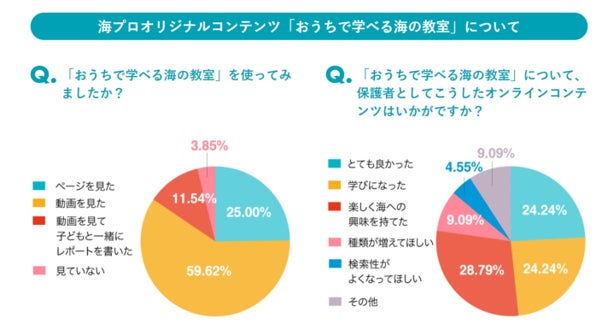 また、保護者にも「おうちで学べる海の教室」の使用について尋ねたところ、お子さんと一緒に動画を見たり、レポートを書いたといった嬉しい声が9割以上!実際に使ってみた感想として、「海への興味が持てた、学びになった、とても良かった」など、おうちにいながらお子さんと参加できる動画コンテンツへ前向きな回答が多くを占めました。
