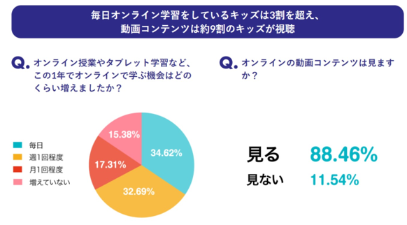 ・毎日オンライン学習をしているキッズは3割を超え、動画コンテンツは約9割が視聴