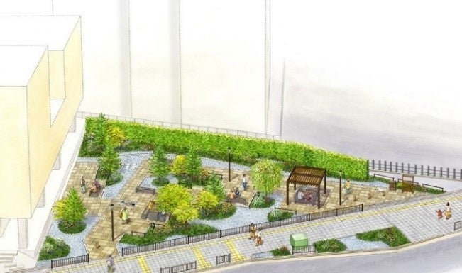 同公園は、同会館東側に位置し、公園入り口に設置されている「駒音公園」の文字が書かれた園銘板は、高さ120センチメートル、横幅115センチメートル、奥行25センチメートルの将棋駒の形。園内には、古くから高級将棋駒の材料に使用されてきた東京都御蔵島村のツゲが植樹されています。また、舗装タイルの一部には、将棋を指す時に使われる「戦法」のひとつである「ゴキゲン中飛車」や「角換わり腰かけ銀」の形を採用した戦法ロゴをデザイン。同会館と調和し、将棋のまちの玄関口にふさわしい公園として来訪者を迎えます。