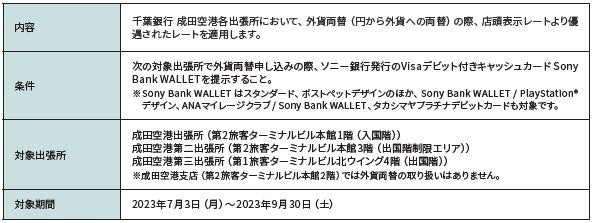 ソニー銀行株式会社(代表取締役社長:南 啓二、本社:東京都千代田区、以下 「ソニー銀行」)は、株式会社千葉銀行(取締役頭取:米本 努、本社:千葉県千葉市、以下「千葉銀行」)と「千葉銀行 成田空港各出張所における外貨両替優遇キャンペーン」を2023年7月3日(月)より実施しますので、お知らせいたします。