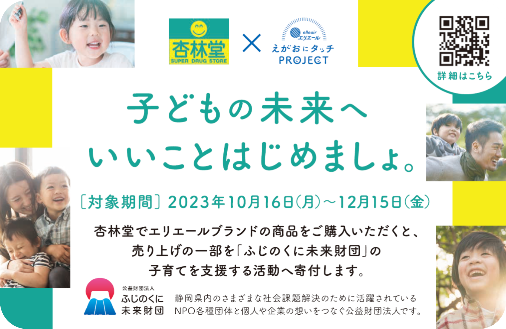 「エリエール えがおにタッチPROJECT」に賛同いただいた杏林堂と協同で、2023年10月16日(月)~12月15日(金)に「子どもの未来へ いいことはじめましょ。」キャンペーンを実施しました。期間中に杏林堂店舗にてエリエールブランドの商品をお買い上げいただくと、売り上げの一部が「ふじのくに未来財団」を通して子育てを支援する活動に寄付されるキャンペーンで、このたび720,639円の寄付を行いました。