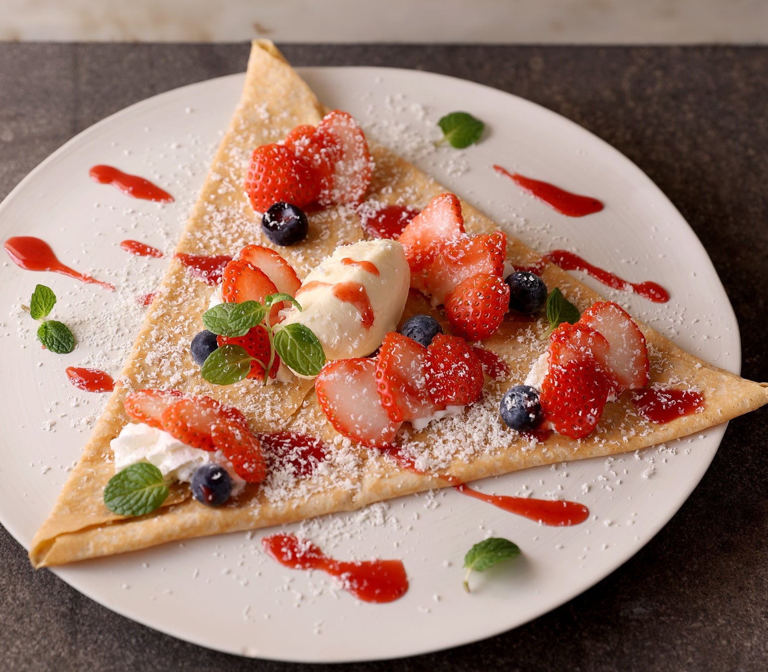 商品詳細 :ライ麦入りの自家製クレープをしっとりと焼き上げ、フレッシュの『やよいひめ苺』とフランス産のホワイトチョコレートを散らし、バニラアイス、ホイップクリームをトッピング。イチゴのソースを掛けて仕上げています。やよいひめイチゴのたっぷりのった、大満足なやよいひめイチゴとホワイトチョコレートのクレープをぜひお楽しみください!