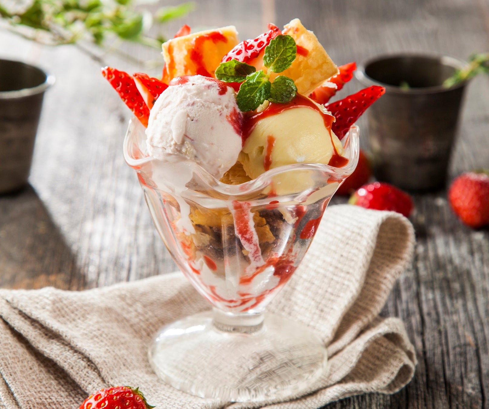 商品詳細 :フレッシュな『やよいひめ苺』をたっぷり使用し、自家製苺ムース、ストロベリーミルクとバニラの2種類のアイスを合わせました。仕上げにサクサクのパイ生地を飾り、ホイップクリーム乗せの華やかで贅沢なパフェです。ハーフサイズもありますので、食後のデザートにも最適です。
