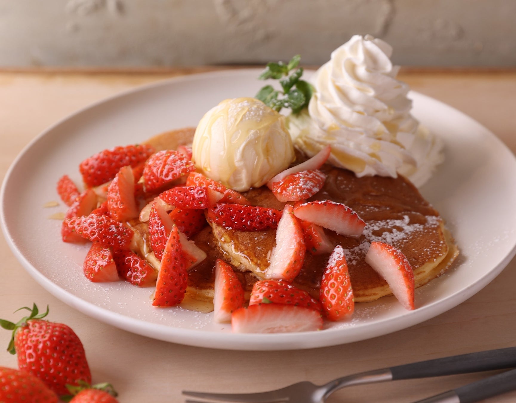商品詳細 :注文を頂いてから焼き上げるふわふわのパンケーキにたっぷりの『やよいひめ苺』とホイップクリームを添えてご用意します。お好みでメープルシロップをたっぷりかけてお召し上がりください。