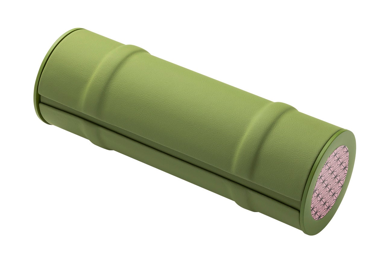 禰󠄀豆子の竹をメガネケースで表現しました。凹凸もつけて竹のイメージを再現。側面には羽織の柄があしらわれています。