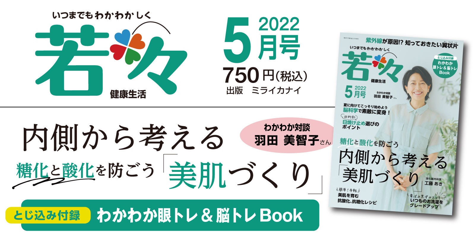 『若々』5月号では、「酸化」と「糖化」に注目した美肌づくりや紫外線対策など、夏に備える対策を掲載しています。「酸化」と「糖化」は見た目の老化だけでなく、体の衰えまで引き起こす最大要因。老化の二大要因を抑えることは、生活習慣病の予防にもつながるといわれています。
