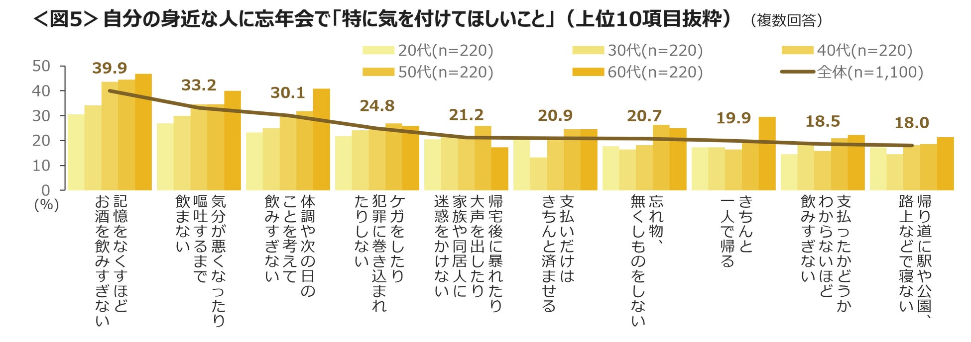 自分の身近な人に忘年会で特に気を付けてほしいことは、「記憶をなくすほどお酒を飲みすぎない」が39.9%と最も高く、「気分が悪くなったり嘔吐するまで飲まない」「体調や次の日のことを考えて飲みすぎない」も3割台。