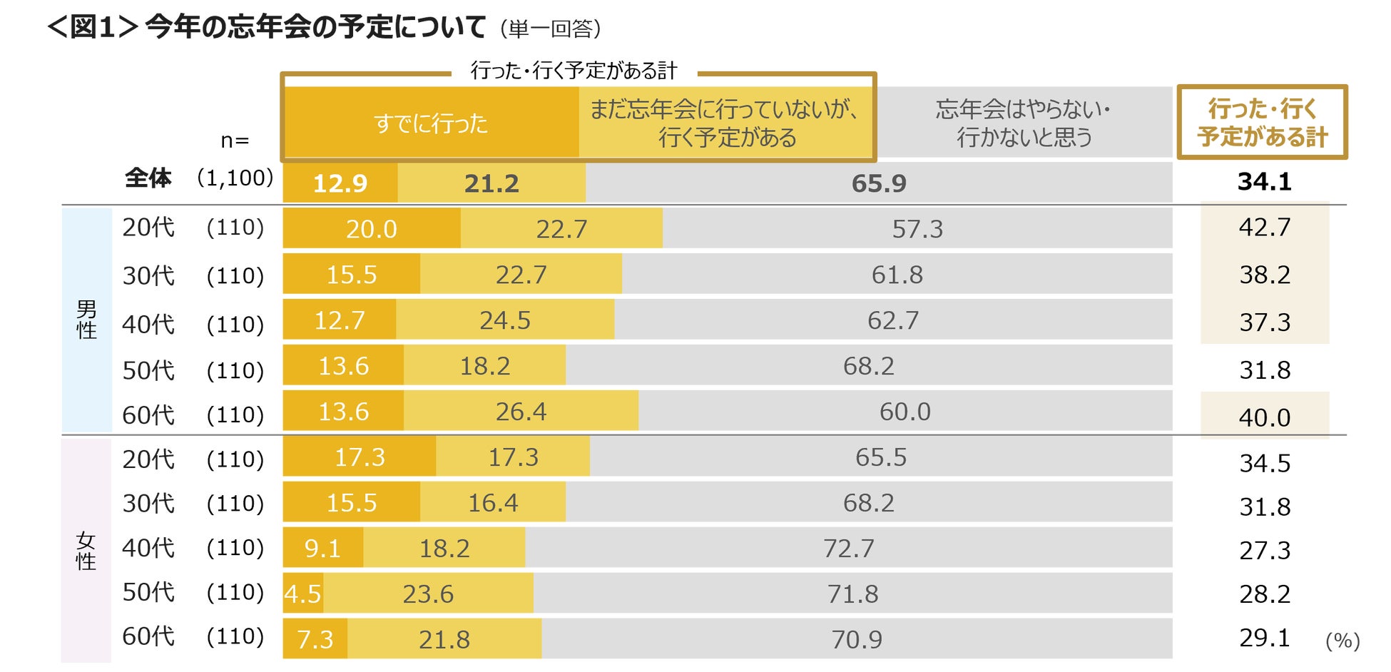 今年の忘年会、すでに行った・予定ありは34% 久しぶりに会える、少人数、一次会ですっきり終わる会が好まれる