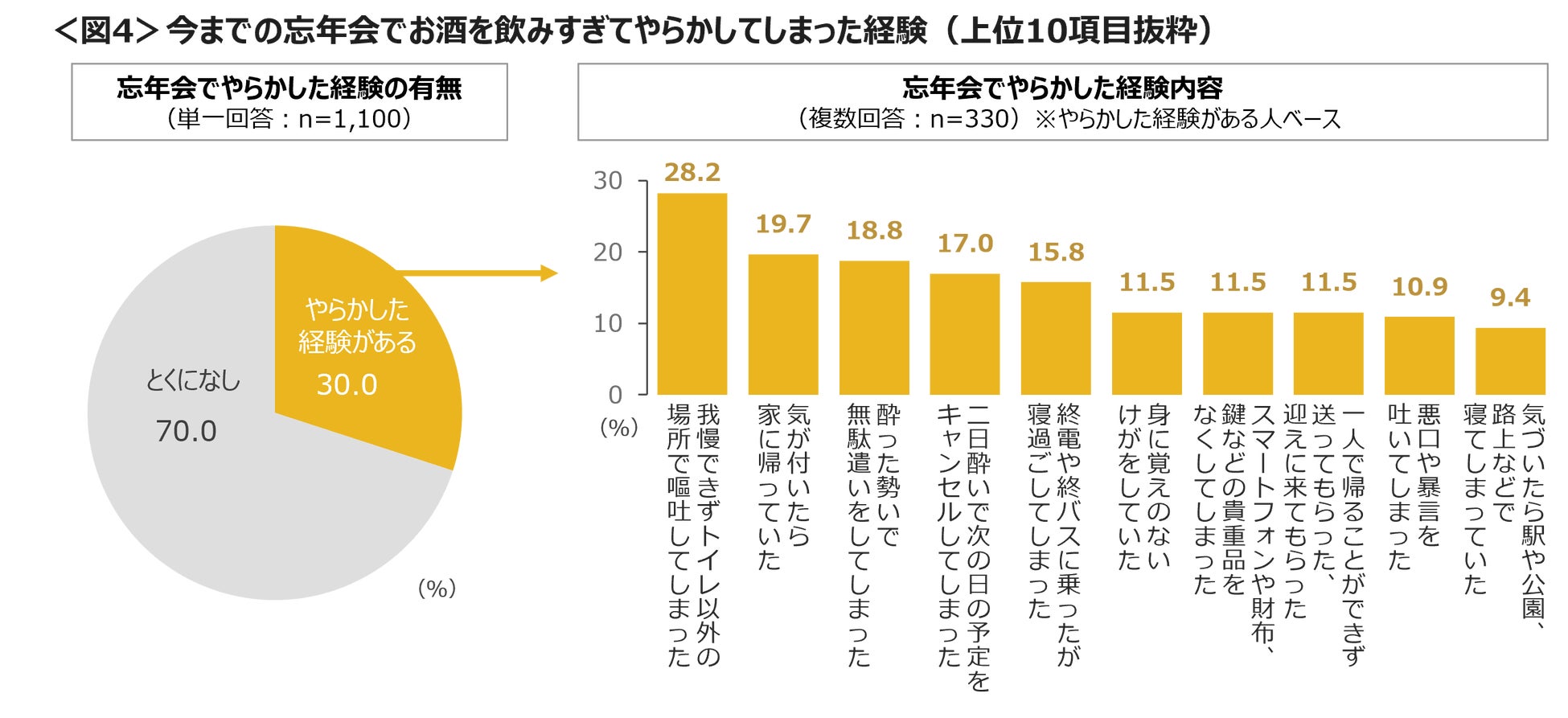 忘年会でお酒を飲みすぎて「やらかした経験がある」人は3割で、「我慢できずトイレ以外の場所で嘔吐してしまった」経験が多い。<図4>