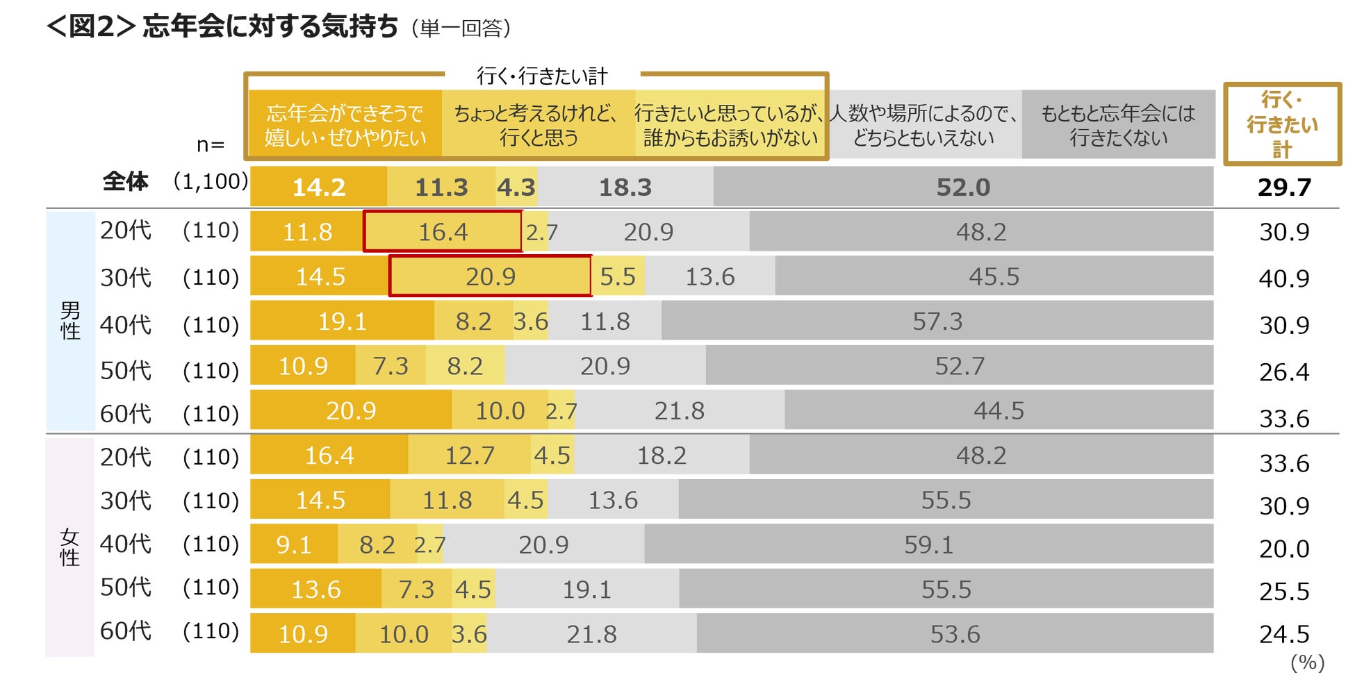 男性20~30代は「ちょっと考えるけど、行くと思う」が他の性年代と比べて高く、忘年会への参加率は低くないがあまり積極的ではないと考えられる。<図2>