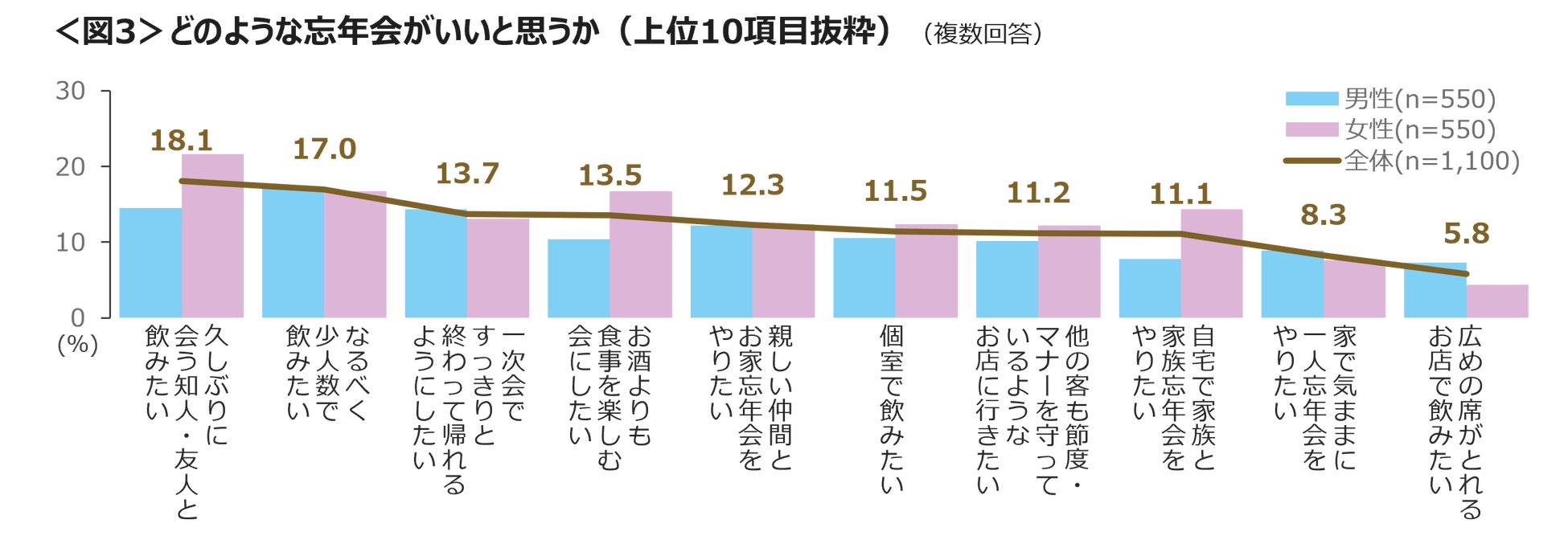 女性は「お酒よりも食事を楽しむ会にしたい」「自宅で家族と家族忘年会をやりたい」が高い。<図3>