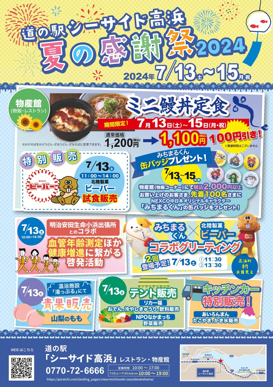また、7月13日(土)は、高浜町に初お目見えの北陸製菓株式会社のマスコットキャラクター「ビーバー」とNEXCO中日本オリジナルキャラクター「みちまるくん」の着ぐるみコラボグリーティングを実施しますので、この機会にぜひシーサイド高浜にお立ち寄りください。