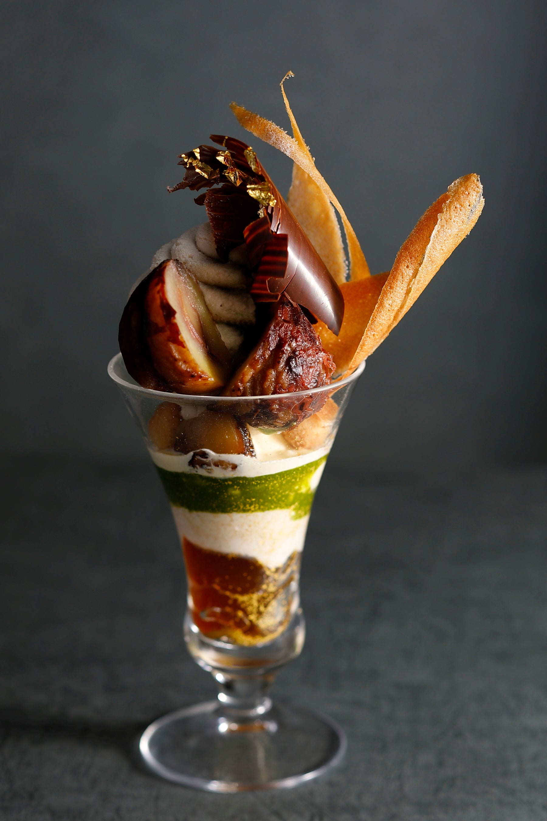 平安時代の文献にも記された歴史あるブランド栗です。大きくて美味しい栗の代名詞。兵庫県から京都府にかけての旧丹波国で出来た丹波栗の中でも大粒の「銀寄」、「筑波」の3Lサイズを使用し、ほうじ茶と玄米茶を組み合わせた和風テイストなパフェに仕立てました。グラスの中に閉じ込めたほうじ茶ゼリー、和栗のクリーム、バニラアイスクリーム、シュトロイゼル、ホワイトチョコレート、玄米茶アイスクリームなど、稀少な“丹波栗”の味わいを深める様々なマリアージュをお楽しみください。