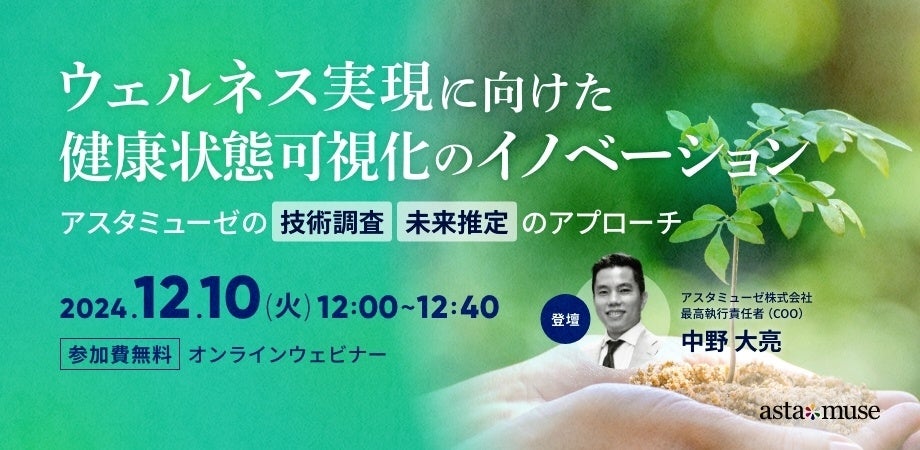 アスタミューゼ株式会社(本社:東京都千代田区、代表取締役社長 永井歩)は、2024年12月10日(火)12:00-12:40に、企業の研究開発、新規事業担当者向けにウェルネス分野の最新動向をお話する無料ウェビナー「ウェルネス実現に向けた健康状態可視化のイノベーション ~アスタミューゼの技術調査・未来推定のアプローチ~」を開催いたします。