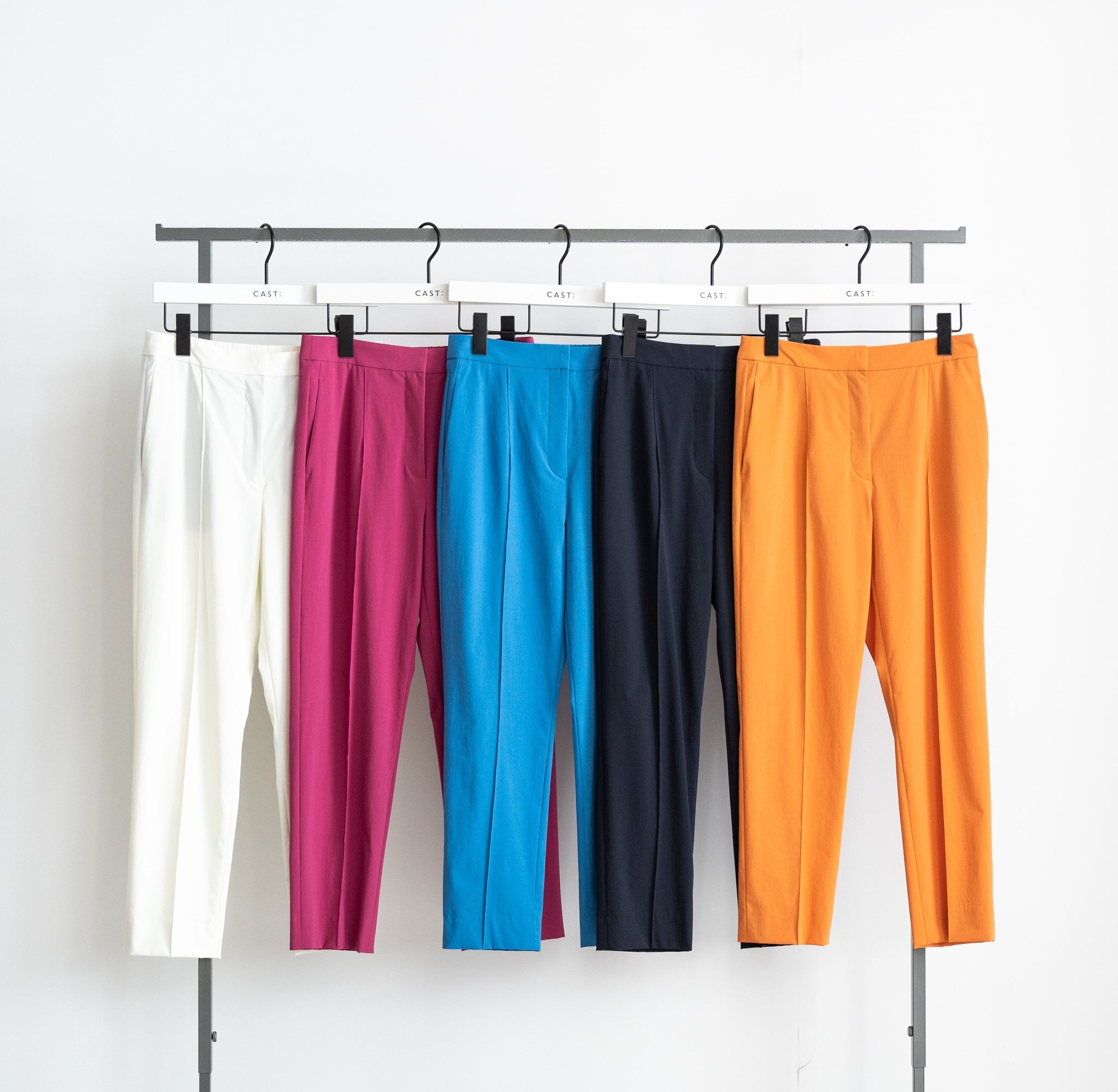 「CAST:」の定番の細身テーパードパンツをはっ水加工を施したストレッチ性の高い生地で作りました。