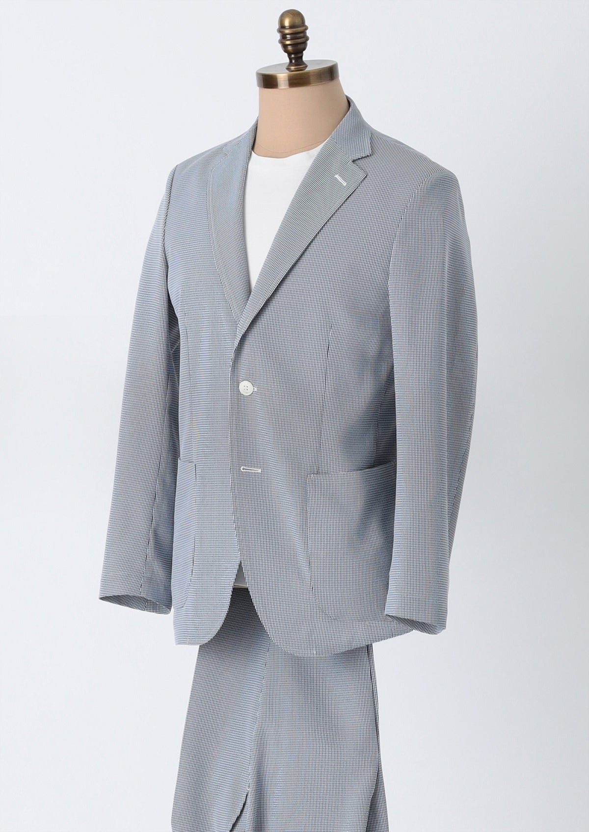 ウールのようなポリエステル素材を使用した軽量なライトジャケットとパンツ。サッカー調のシボが特徴の素材はサラッとしたタッチが特徴で蒸し暑い時期にも快適な着心地です。表地が水をはじきやすいだけでなく、はっ水糸という特殊な縫い糸を使用し縫い目からの浸水を防ぐ仕様のため、雨の日でも快適に着用できます。中が空洞の「中空糸」を使用しているため非常に軽量で、防シワ、紫外線カット、ウォッシャブルと機能性も高く、梅雨時期から夏まで活躍します。