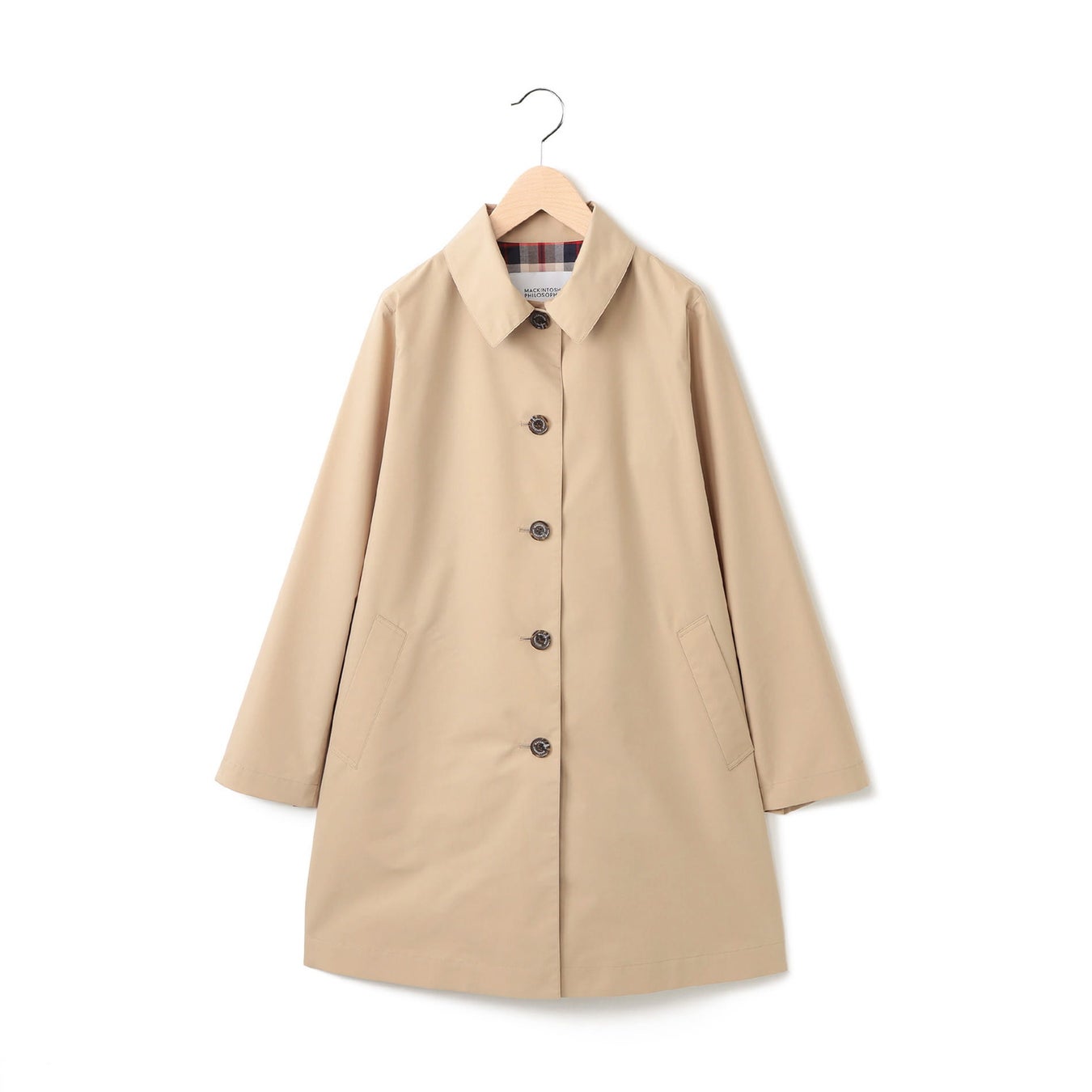 「MACKINTOSH PHILOSOPHY」オリジナルの素材であるはっ水加工を施したレインウェザークロスを使用しています。独特なハリ感と上品な光沢感があり、シワになりにくいのが特徴です。トラディショナルでシンプルなデザインのステンカラーコートはトレンドに左右されずに長く着用できます。