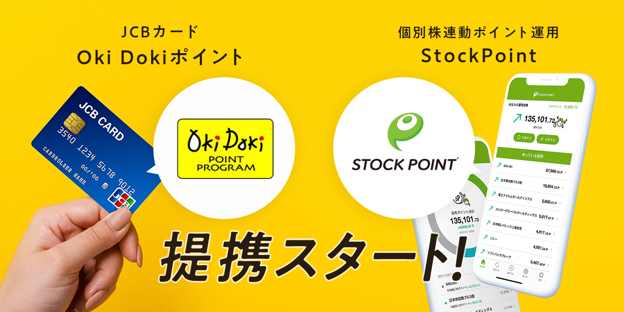 株式会社ジェーシービー (本社:東京都港区、代表取締役会長兼執行役員社長:浜川 一郎、以下:JCB) と、世界初の株価連動型ポイント運用サービス「StockPoint」を提供するSTOCK POINT株式会社(本社:東京都港区、代表取締役:土屋 清美、以下:STOCK POINT)は、JCBのポイントプログラム「Oki Dokiポイント」を「StockPoint」に交換できるサービスを、2021年12月16日(木)より開始することをお知らせいたします。