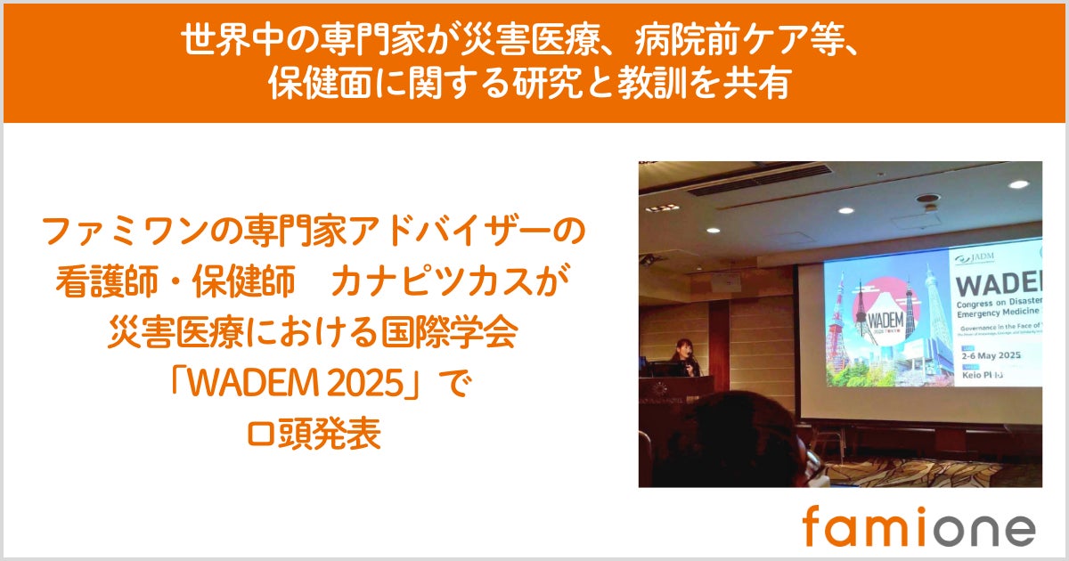 「子どもを願うすべての人によりそい 幸せな人生を歩める社会をつくる」をビジョンに掲げ、法人の従業員向け福利厚生や自治体の住民向け支援を行うヘルスケアサポートサービス「ファミワン」 https://famione.com/benefit/などを展開する株式会社ファミワン(本社:東京都渋谷区、代表取締役:石川勇介)の専門アドバイザーである看護師・保健師 カナピツカス美南が、2025年5月に東京で開催されたWADEM 2025(The World Association for Disaster and Emergency Medicine:第23回世界災害救急医学会)において研究発表(口頭)をいたしました。