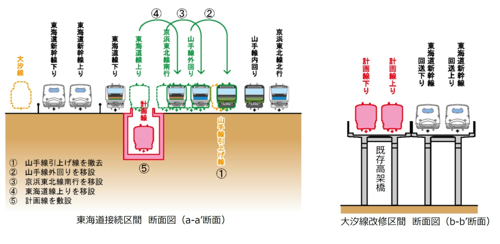 田町駅の東京方にある山手線引上げ線を撤去し、山手線外回り、京浜東北線南行、東海道線上りを順次移設して、東海道線上下間にスペースを確保します。そのスペースを用いて、開削トンネルやシールドトンネルを構築することで、東海道線と大汐線(現在休止中)が接続する線路を敷設します。