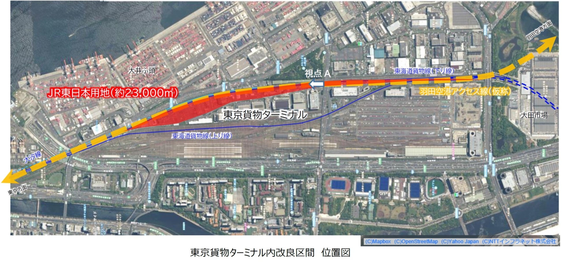 東京貨物ターミナル内にJR東日本が保有している用地を用いて、羽田空港アクセス線(仮称)の運行に必要となる車両留置線や保守基地線を整備(約23,000㎡)します。